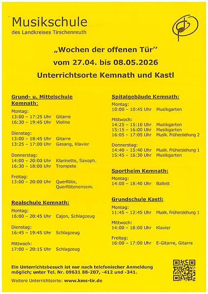 Im Zeitraum vom 27. April bis 08. Mai 2026 veranstaltet die Kreismusikschule des Landkreises Tirschenreuth die „Wochen der offenen Tür“. Interessierte…