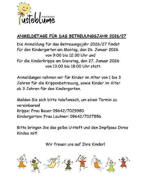 Kinderhaus Pusteblume: Anmeldetage für das Betreuungsjahr 2026/27