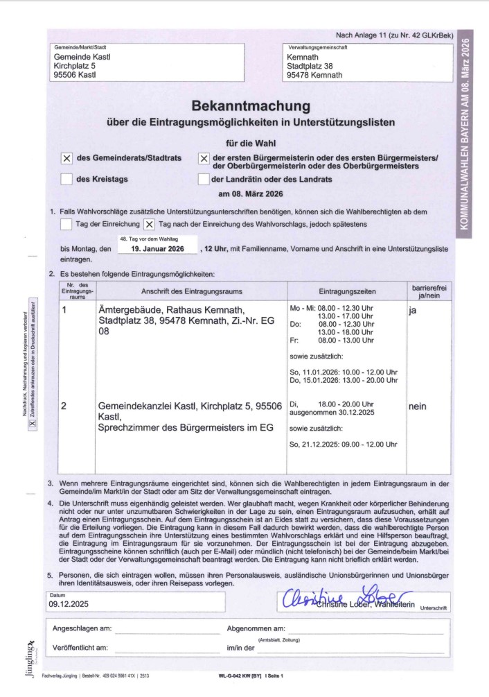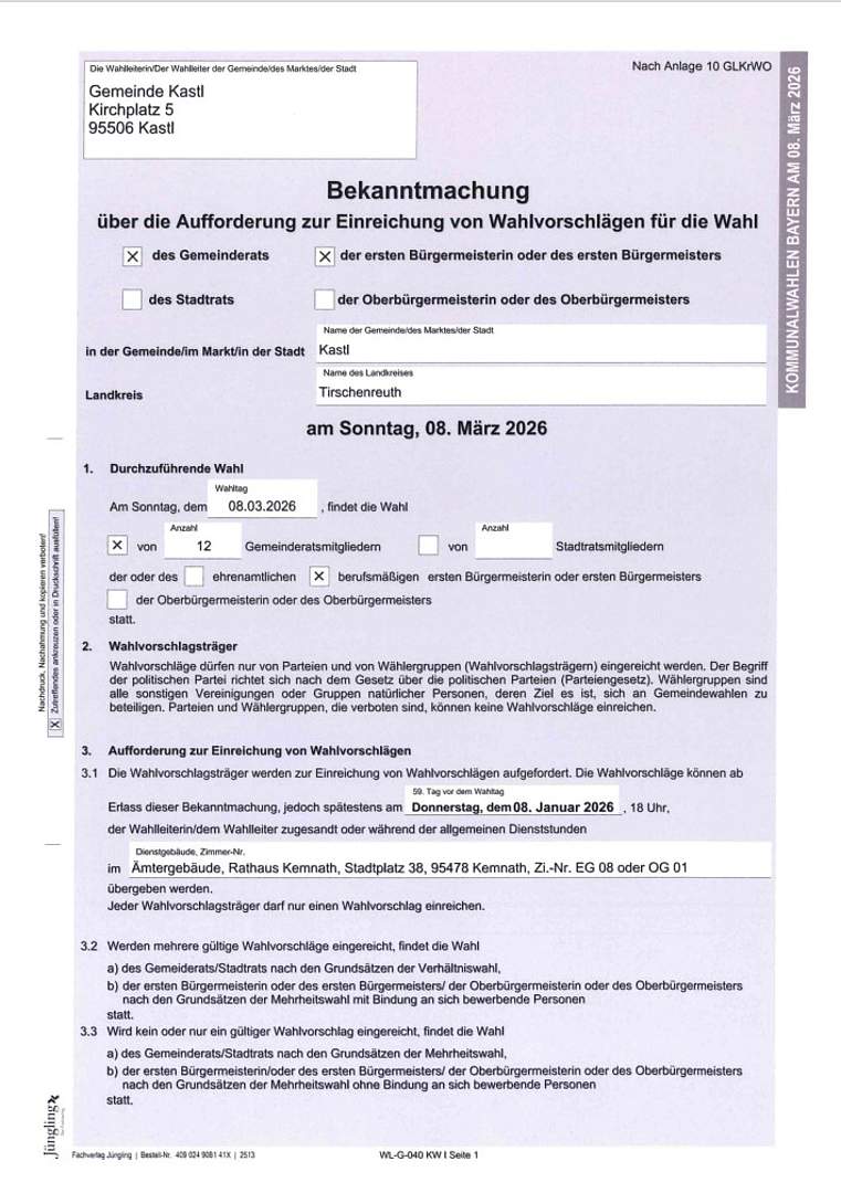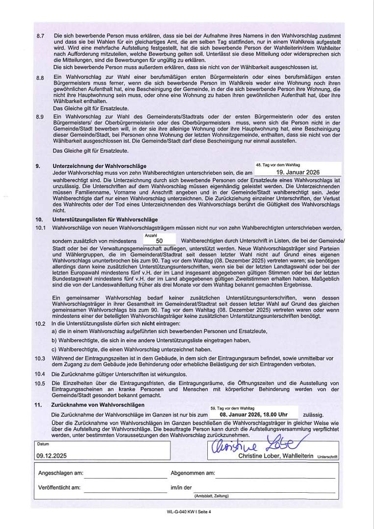 Wahlscheine mit Briefwahlunterlagen dürfen somit erst deutlich später als bei bisherigen Wahlen, und zwar frühestens ab Montag, 16.02.2026, durch das Wahlamt postalisch versandt werden.