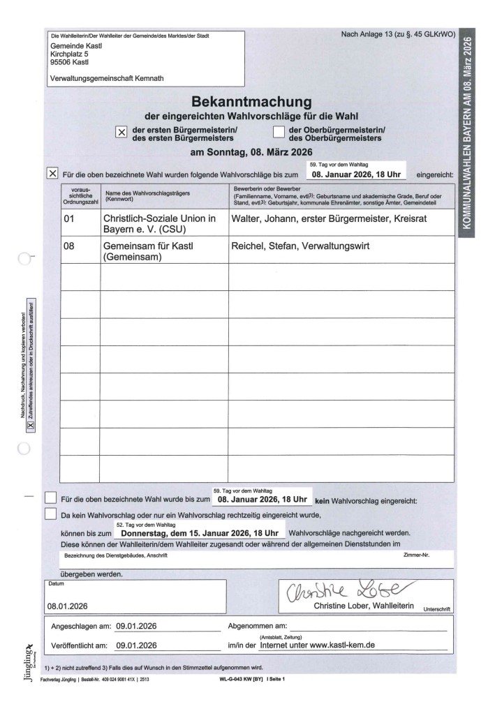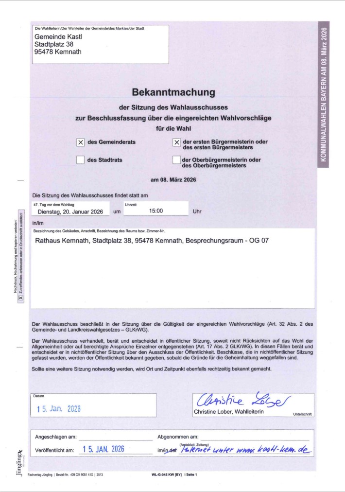 Wahlscheine mit Briefwahlunterlagen dürfen somit erst deutlich später als bei bisherigen Wahlen, und zwar frühestens ab Montag, 16.02.2026, durch das Wahlamt postalisch versandt werden.
